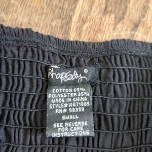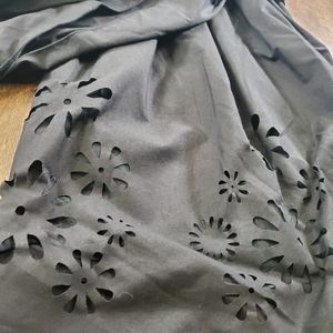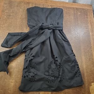 Rhapsody black strapless mini dress with floral cutout design at hemline & tie waist