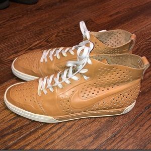 RARE!! 2010 Nike Perforated Hightops. Tan full grain, perforated, leather uppers, leather insole, unlined. Leather has been conditioned and soles hand scrubbed clean. Excellent preowned condition.
