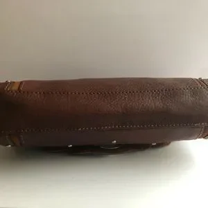 Vintage “sample” brown leather purse. Suede details. Silver toned hardware. Braided leather details. Removable leather shoulder strap. Excellent condition, no damage to bottom leather. Some wear on metal hardware-see pictures.