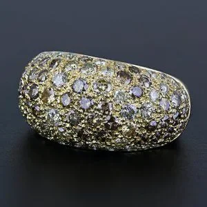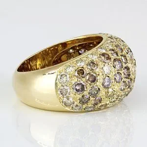 This Cartier branded ring is made of 18 karat yellow gold and features a stunning pavé setting of 80+ round-cut white & brown diamonds, amounting to 4 carats in total. The rounded band is sized at 5.5 & is resizable by any qualified jeweler. The inside of the band is stamped with 2 "Cartier" wordmarks, "1994" "750" and a serial number.