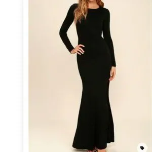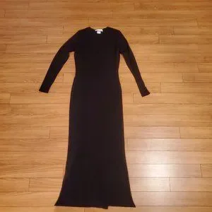 Elegant maxi dress with round neckline, long sleeves, and slits on both sides at the bottom.