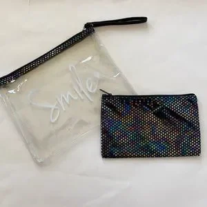 Clear travel bag has a top zip and can be used as a wristlet. Measures approx 10.5” x 8”.