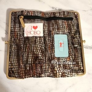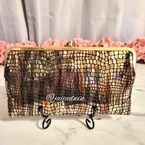This HOBO The Original 'Lauren' wallet is a mixed metallic colors with an embossed scales print. Absolutely gorgeous! Gold metal hardware. Also doubles as a clutch. On the sides are 2 clasp compartments; 1 with zipper pocket, other with 6 card slots & 2 slip pockets. These are perfect pouches to hold your keys, phone, pens, etc... Open the wallet up, which opens/closes with 2 magnets covered in HOBO's signature leather, & there's 3 card slots, ID window, & a zipper pouch that runs the width of the wallet, perfect for cash & phone. Mint, New Without Tag Like Condition! Appx 8.5"x4.5"x1" expandable.