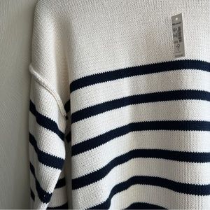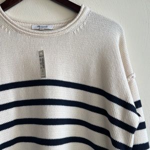 “A classic just got an update—this cotton pullover sweater is styled with a rolled crewneck, drop shoulders and cool nautical stripes. Relaxed fit. Body length from high point of shoulder: 23 3/4" (based on size M). Cotton. Machine wash.” // NWT. Never worn. Color: antique cream. A timeless, breathable sweater in solid weight, exceptionally well made & 100% cotton! Size M available.