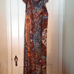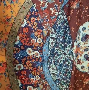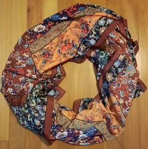 Beautiful large golden scarf, floral print detail, subtle woven pattern. Light and airy fabric, but large enough to be warm when wrapped. No tags, hand wash to be safe. ~ 40" x 108"