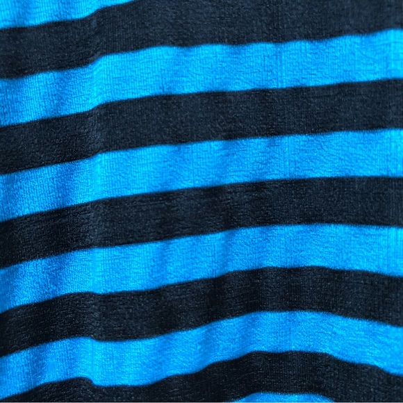 Black and blue striped shirt~~fabric is very slinky and stretchy and fits nicely to the body. Gives me mod vibes or 80s Debbie Harry.