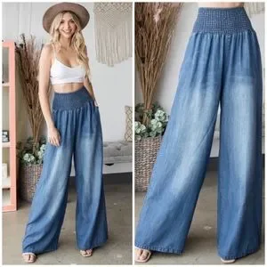 SOLD OUT Denim Blue Washed Wide Palazzo Leg Tencel Casual Smocked High Waist