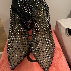 DIAMANTE DETAIL POINTED TOE STILETTO HEEL ANKLE HIGH SOCK BOOT IN BLACK FISHNET