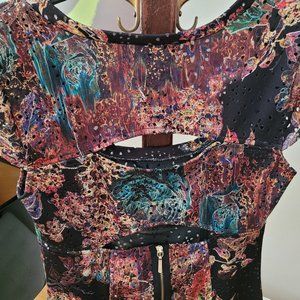This gorgeous knee length dress is in excellent condition (worn once) and has many unique details that make it a stand out! With keyhole cut outs in front and back, cap sleeves, a gold zipper and mix of rich burgundy, black, turquoise and gold tones, it is the perfect dress for fall. It is fully lined and has good stretch to hug your curves! It is a US 8, but fits on the smaller side (more like a 6 - see measurements). From a smoke free and pet free home.