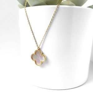 Details - beautiful mother of pearl center, gold tone metal, clover charm, adjustable chain, dainty and lightweight