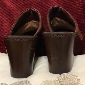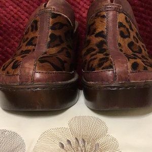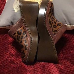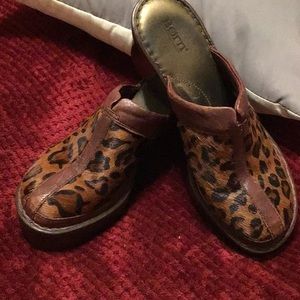 Ladies Born Mule clogs with open back & 3 inch wedge heel/ rubber under sole in excellent condition/color black & brown leopard print trimmed in brown leather/size 9/In very good condition