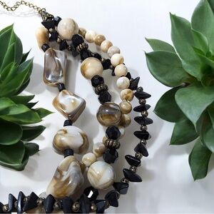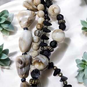 • Material: Mixed-shape lucite beads in creams, browns, and black