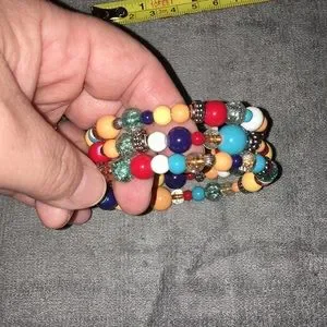 Hi! It’s me again and here is a beautiful and colorful chunky glass and metal beaded memory wire bracelet. This is style A. I have a few that look similar as this is one of my signature styles. The one in the listing is the one you will get.