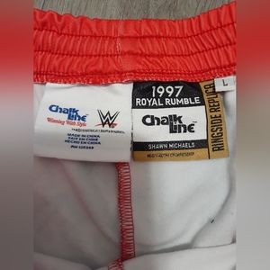 Shawn Michaels Royal Rumble 1997 ringside replica track pants mens size large. They are new. They have side pockets. Nice large cuff at the bottom. They are 100% polyester. Brand is Chalk Line. Smoke free home.
