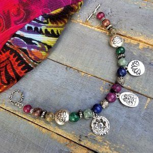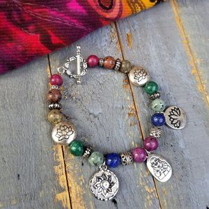 It features semi-precious stone beads, carved silver beads, and lotus flower engraved beads. Three silver charms...Buddha in the center, a lotus flower to the right, and a sunburst to the left. Approx. 8" long. Toggle closure. Such a lovely bracelet!