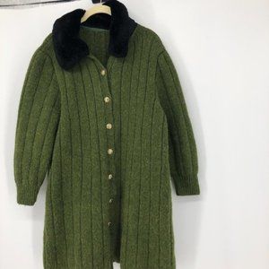 Vintage green knit wool long button up jacket removable black faux fur collar