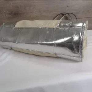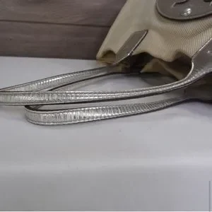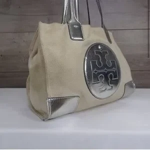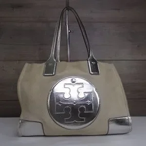 Tory Burch Small Ella Natural Canvas Silver Leather Trim Tote Bag Purse