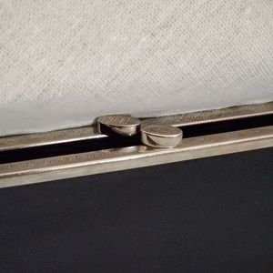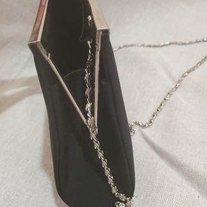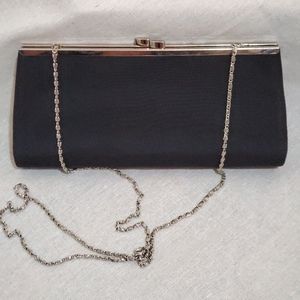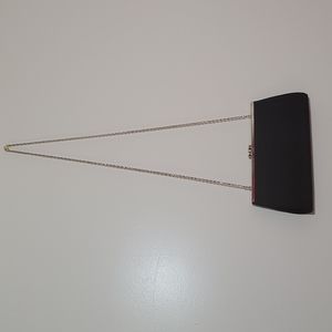 Sleek black material, clasp closure. Silver tone strap is removable.