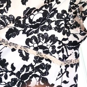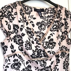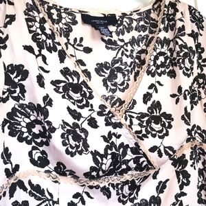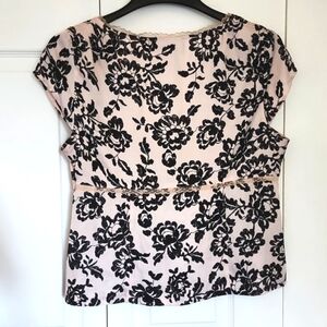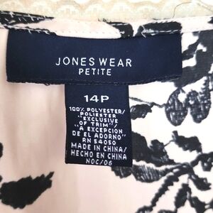 Short Sleeve Top. Jones New York. Beautiful Top with a V crossover neckline trimmed with lace. Size 14 Petite. Measuring 21 inches long 20 inches armpit to armpit 19 inches waist. The waist is also trimmed with lace. Material feels soft and silky. 100% polyester. Zipper is hidden on the side and it's 9 inches long. The color is pale pink beige/pinkish with black flowers.#Women's #petite #shortsleeve #top #blouse #lace #silky #zipper #jonesofnewyork #blouse #floral