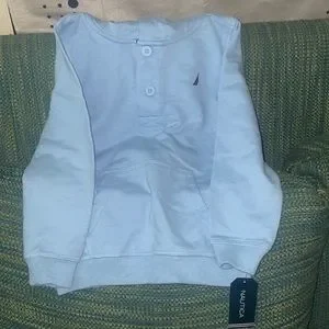 NWT Nautica baby blue sweatshirt with hoodie. It’s a 2 button at top & pullover style. It’s a size 3. Has cute pocket on the front & is very versatile for either gender. It’s very lightweight also.