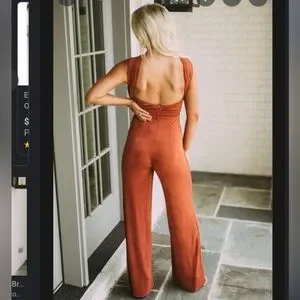 Brand new. Bronze colored flared leg jumpsuit with key hole cut out on chest. Straps can be crossed on the chest or crossed in the back. Zipper closure back.