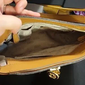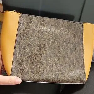 Tan and brown monogram style MK crossbody bag in used good condition, small mark on back of bag shown in pic