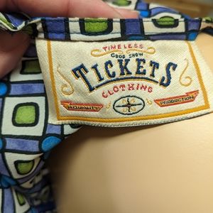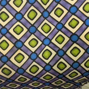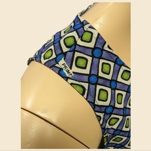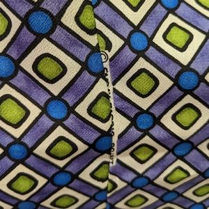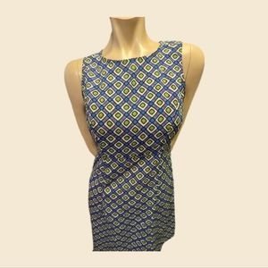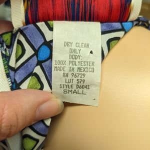 90's does 60's with this fun mini dress! Bright and bold geometric print in white, blue, green and purple. Darted princess seams at the bust give this dress a sleek, tailored look. Perfect for that retro mod look or costume. No flaws, but there are some overlaps in the fabric that show the label (see last two photos). Zippered back. No stretch. 100% polyester. Seems true to size.