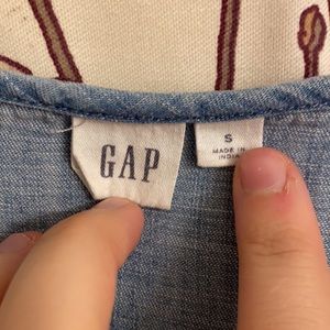 Relaxed but elevated, this chambray shirt is gently worn and in great condition. V neck with peplum bottom.