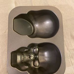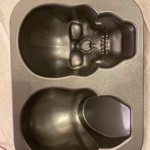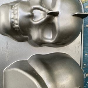 This is a skull head mold for holloween cakes. Made in the USA. Says 9 cups. Unique!!!!3-D in excellent condition!!