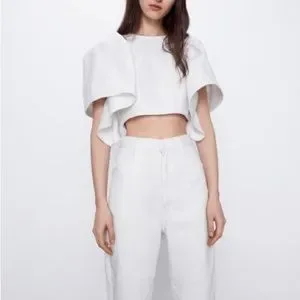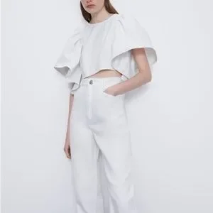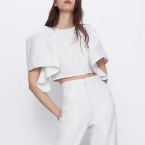 So simple and dramatic at same time…. Cropped length.. love large ruffled sleeves. Wear with jeans or long skirt