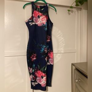 Blue with multi color floral print. Slit in back. Calf length. Worn once. Size 10.