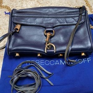 This is a used Rebecca Minkoff Mini MAC Bag in navy blue smooth leather with gold toned hardware. The dimensions are 6.5”x9”x2” with a detachable strap that can be crossbody or shoulder. Some minor marks on bag nothing bad. Comes with dust bag and extra tassel leather.