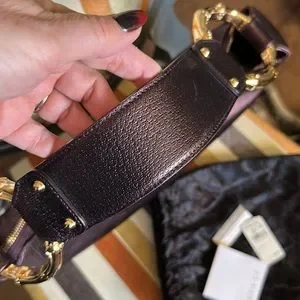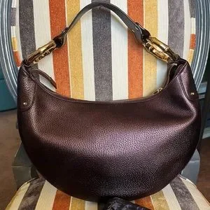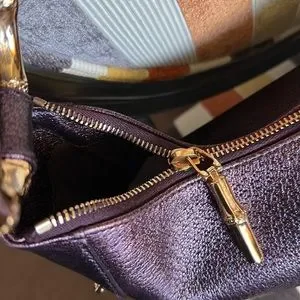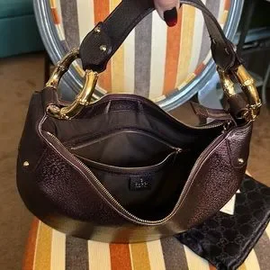 Gorgeous Gucci Bamboo Ring Hobo in gently worn pre-loved condition. No major flaws to note. There is light scratching to leather here and there that is hard to capture on camera because of the metallic color and pebbled texture. The most prominent scratches are on the bottom as shown. Hardware is excellent, zippers work well. The weight of the gold bamboo zipper pull tends to open the zipper a couple of inches on the closing end. Fabric interior is clean and odor free with one zip pocket. Bag still has retained most of its structure.