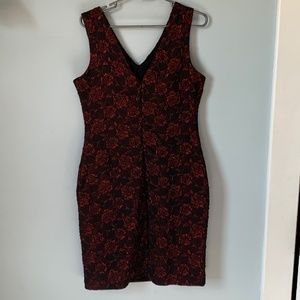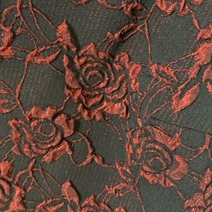 Sleeveless, black dress with textured shimmery red rose pattern. Minimal stretch.