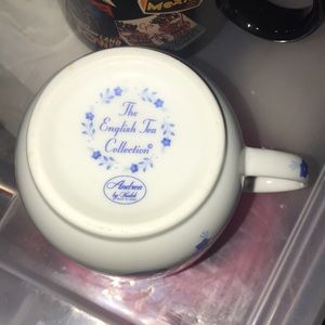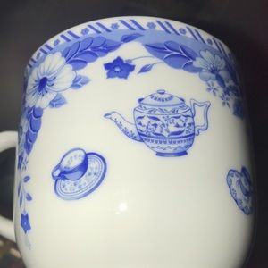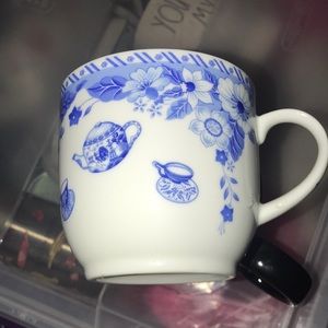 The English Tea Collection Mug with blue floral print. Print has flowers mugs hats and tea pots. Handle is also printed with floral design. Used condition but no chips or cracks. Stands 3.5”.