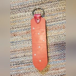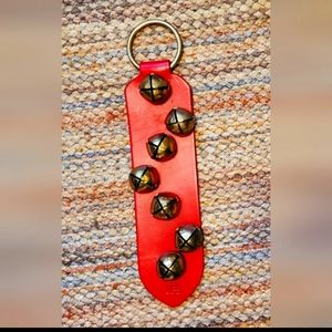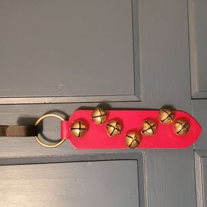 Vintage MBS red leather and brass sleigh bells door hanger. 15 inches long total.