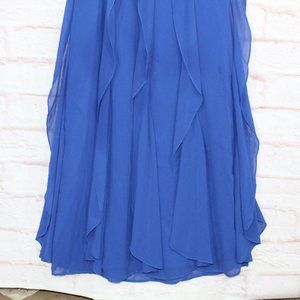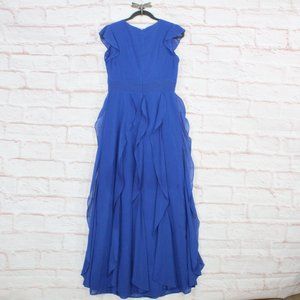 Lace & Mesh Blue Polyester Lined V-Neck Cap Sleeve Ruffled Long Dress Size M