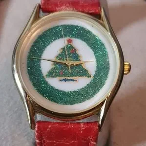 Good used condition. There's some wear on the leather strap. Watch features a goldtone bezel, white dial with printed green ring around edge of dial and a Christmas Tree print in the center,and a red leather strap. Case diameter is 34mm. Watch has a new battery in it also. Really cute watch.