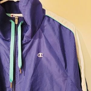 Womens Vintage Champion windbreaker. Blue, white and aqua. Size Large (can fit a Medium). In beautiful pre-loved condition. No flaws or stains. Zipper fully functional. Clean non-smoker home.