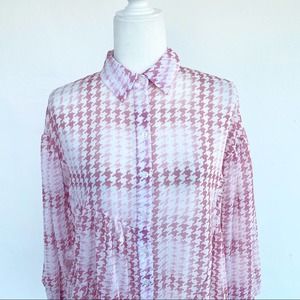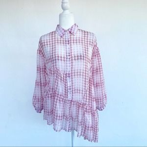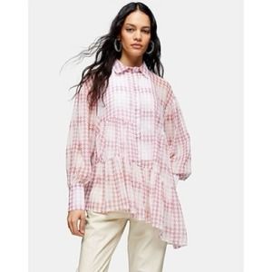 Topshop Pink Check Tiered Long Sleeve Asymmetrical Blouse Button Down Shirt