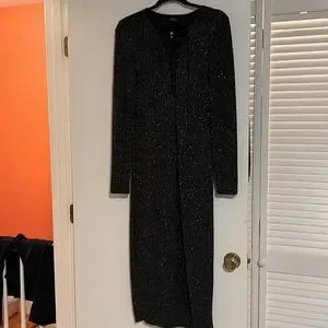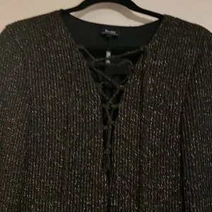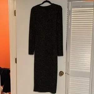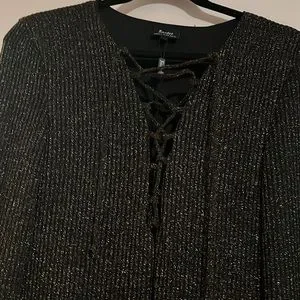 Bardot black dress with gold metallic yarn .size medium. Material polyester, acrylic, elastane, w metallic yarn woven throughout the dress. Like new, only worn once. Great for upcoming holiday season