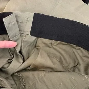 New with tags. Excellent condition. There’s a small mark on the back pocket which looks like ink, I am assuming that it would wash out, see pictures. Thick waist band which illuminates gaps in the back of your pants, see pictures. These pants button with an inside button and an outside button. The inside button is missing see pictures.