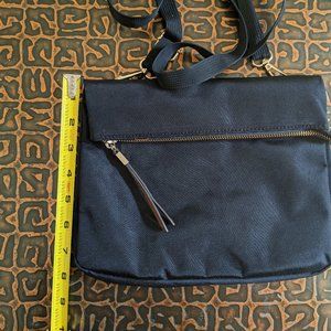 This is a great little bag, but unfortunately, there weren't measurements when I purchased it from its previous owner- d'oh! So I've added them to this post in the hopes that this sturdy little piece will find a new home. Black nylon with an open interior, brown PU leather accents, and gold hardware on the adjustable strap.