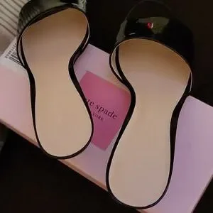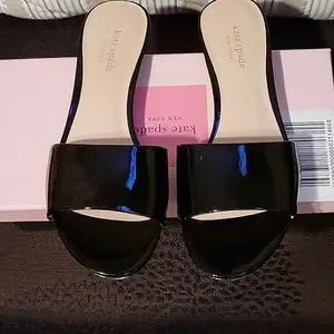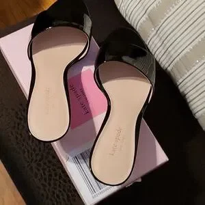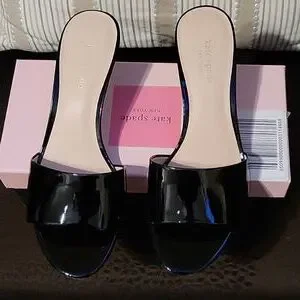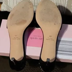 patent leather very good condition only worn twice, comfortable easy to walk in looks great with pant, dressy short set,and dresses any length its a kitten heel 2"