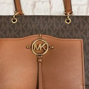 Michael Kors Amy Large Tote Bag. Made of high quality materials in an all over MK pattern. Classic brown luggage color combination. Golden colored contrasting hardware adds extra style to this gorgeous Tote purse. Sure To Become A Favorite !