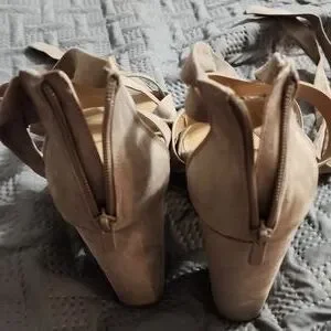 Rich faux suede wraps timeless Tapered Laceup Platform Heel. 4" tapered heel and zipper on back of both heel. never been worn and zippers work perfectly. shoes are wide.