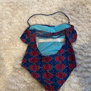 NWT boho print one-piece swimsuit with lined cups. Has a low-plunging back and five mini strap detail across the back as pictured. It has the option to remove the halter strap and make it a bandeau top. I have two. One is small and one is medium.