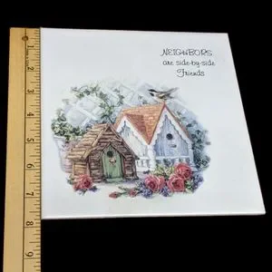 This is a lovingly used & in great condition tile decoration that is perfect gift for your favorite neighbor! Square tile is either a ceramic or porcelain, & has a beautiful image of two birdhouses, lattice fence, ivy, flower pot, bouquet, & a chickadee! In the top right corner it states "Neighbors are side-by-side Friends". Corkboard on back. Meant to lean on a counter or table, there is no hanging hardware or stand. Great for housewarming & welcoming a new neighbor! See pics for up close details & measurements. Bundle & save for best offer! Smoke free, pet friendly home.