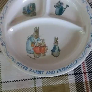 Adorable Peter rabbit melamine plate. Great condition (few tiny knicks on front near the watering can) Diameter: 8 1/4"