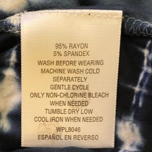 This black and white tie dyed tunic is so comfortable. It is made of 95% Rayon and 5% Soandex. I wash cold and hang to dry. It’s been gently worn.